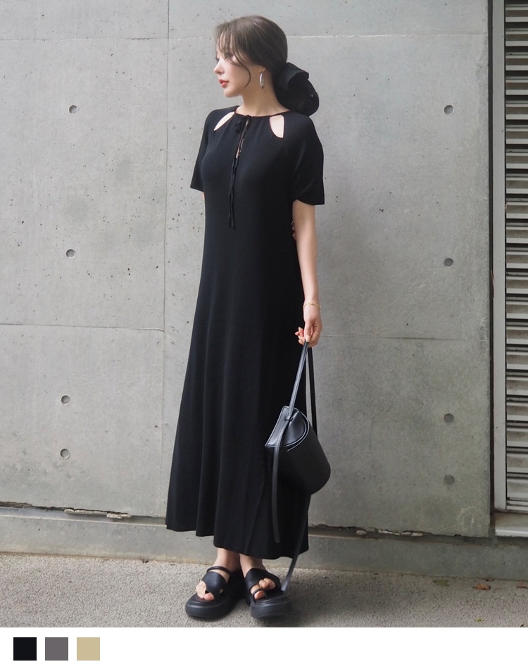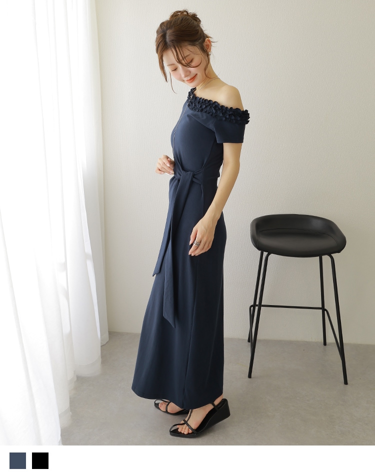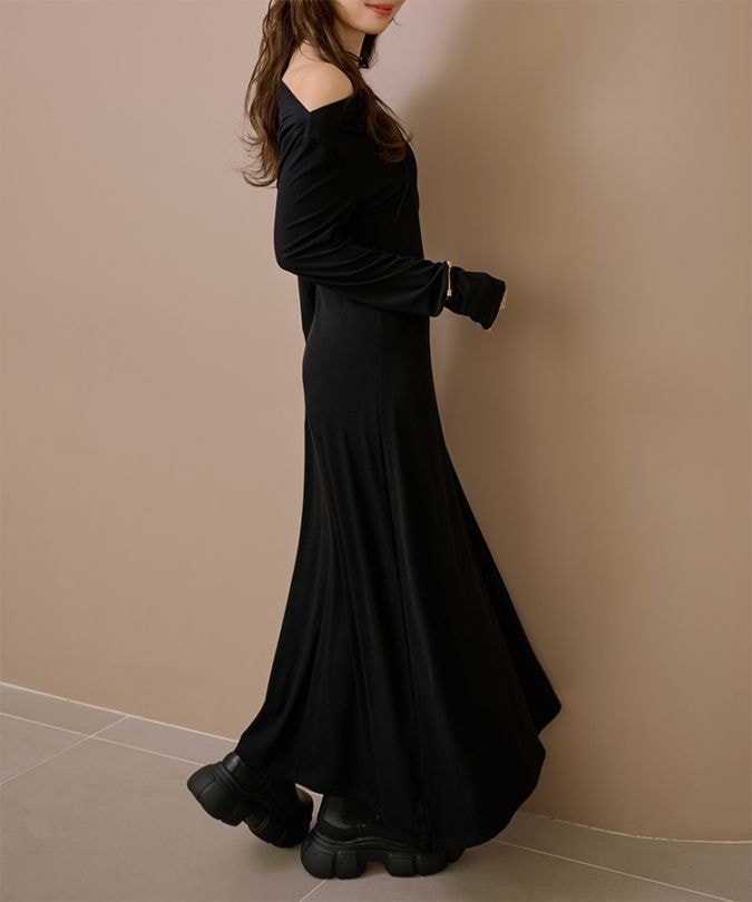 open shoulder gather long dress