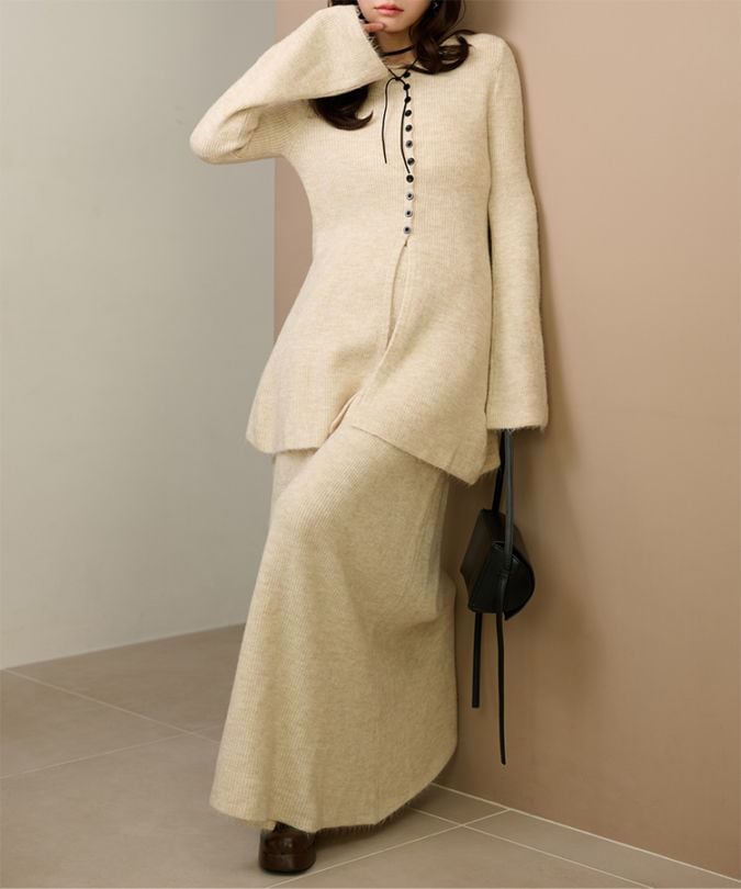 front slit collared button knit set up