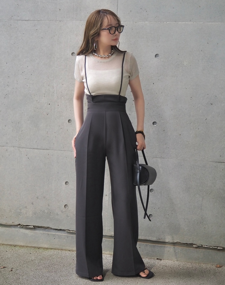 | SIZE | 着丈 | ウエスト | ヒップ | 股上 | 股下 | 渡り幅 | 裾幅 | 肩紐(最長) |