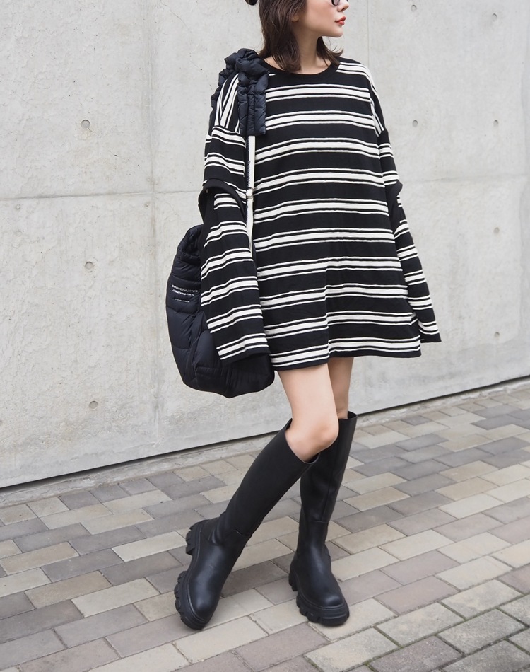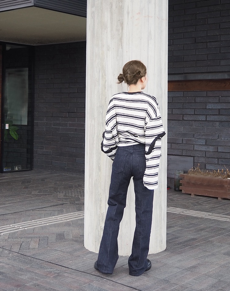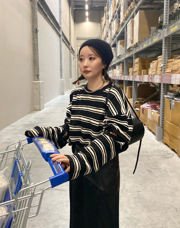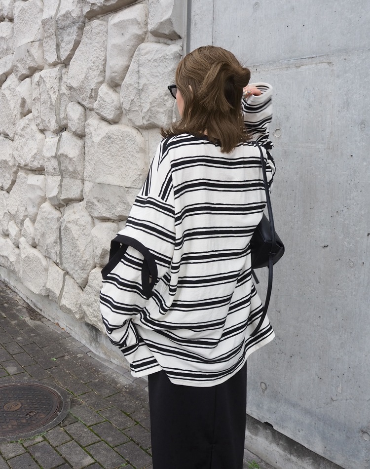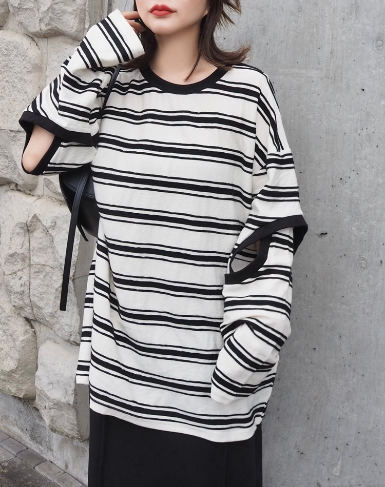 袖のカットアウトデザインがポイントのリラクシーなオーバーサイジングで体型カバーもしてくれるボーダートップス。