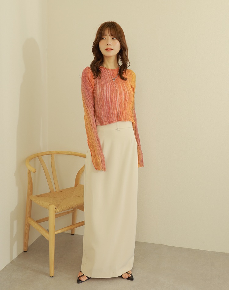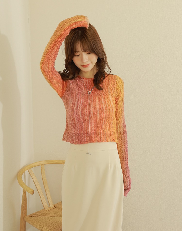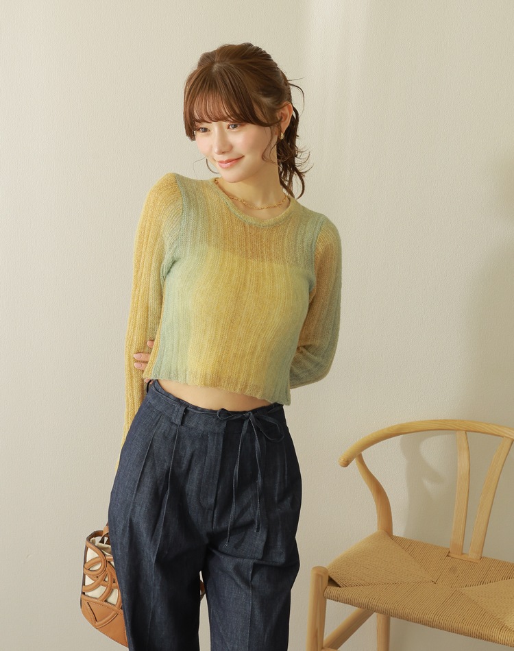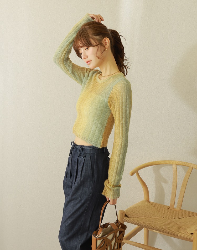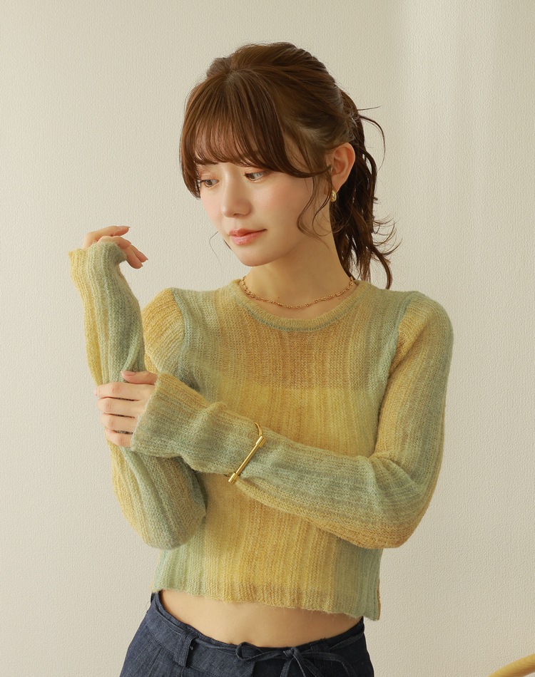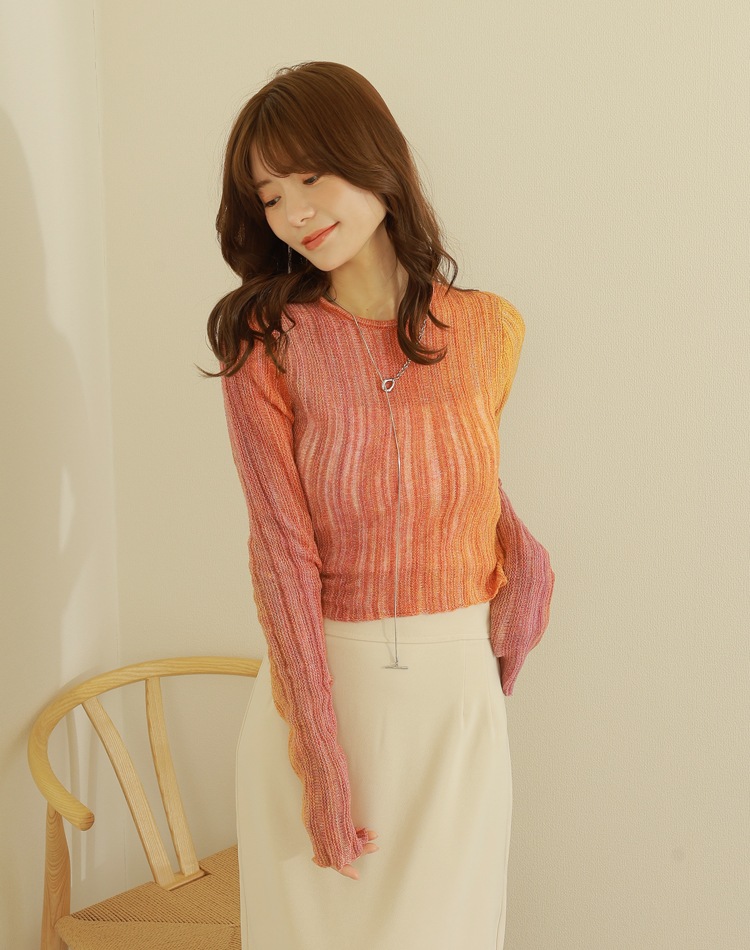 鮮やかなグラデーションカラーが目を引く、シアーニットトップス。