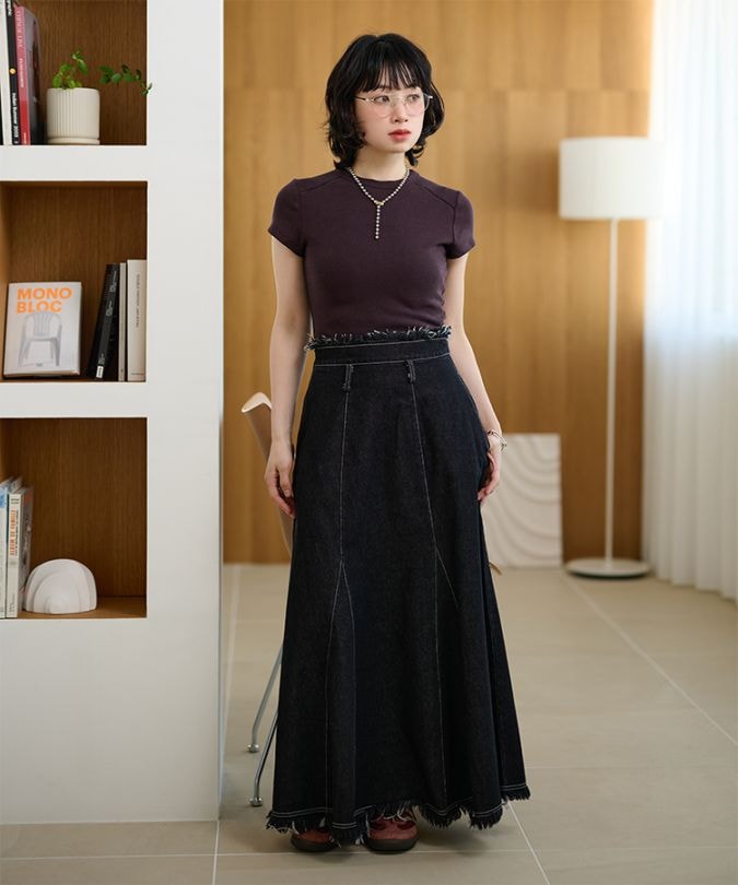 fringe stitch denim long skirt