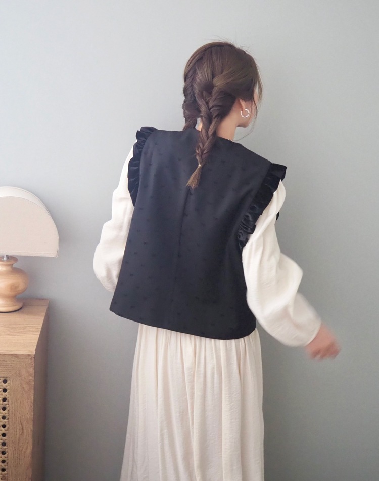 袖にはフリルをあしらい、遊び心のあるデザインに仕上げました。