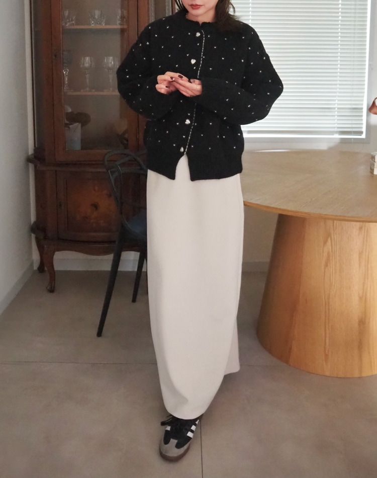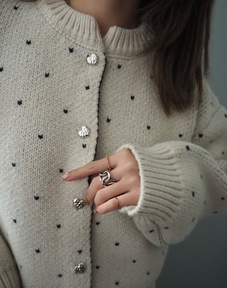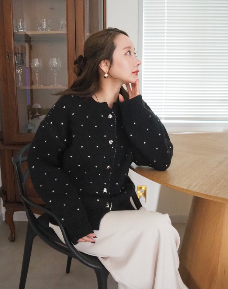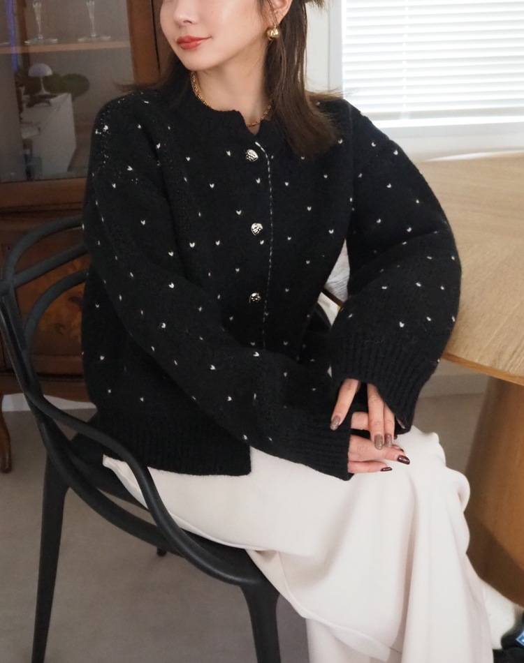 甘くなりすぎない小さめなハート柄がかわいいカーディガン。