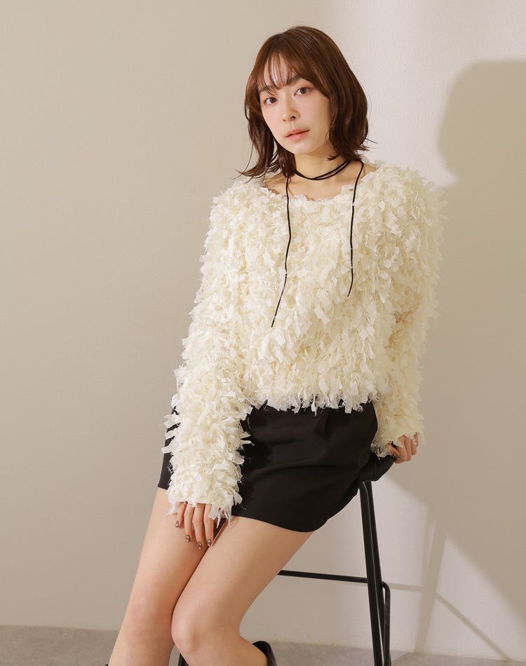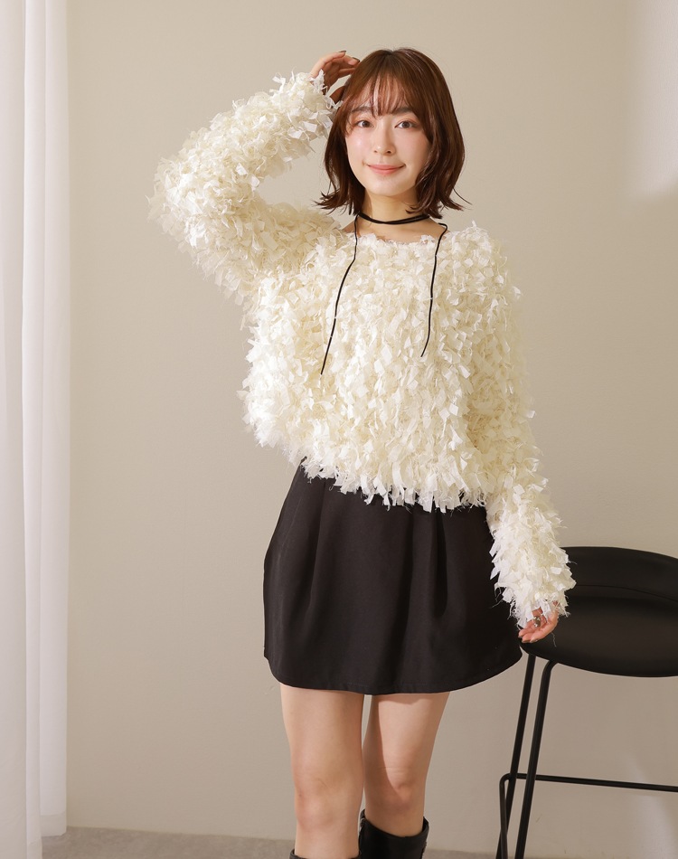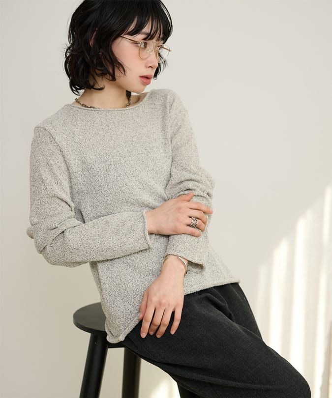 表面感のあるテープフェザーが映えるクルーネックプルオーバー。