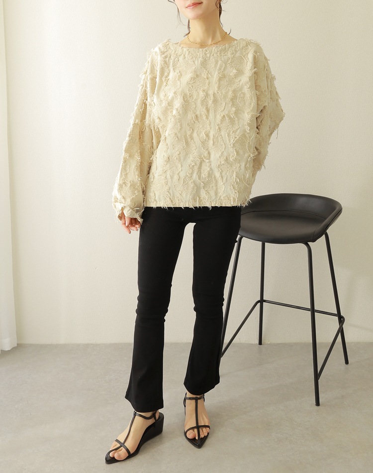 横に開いた広めのネックラインが女性らしく、デコルテを美しく見せてくれます。