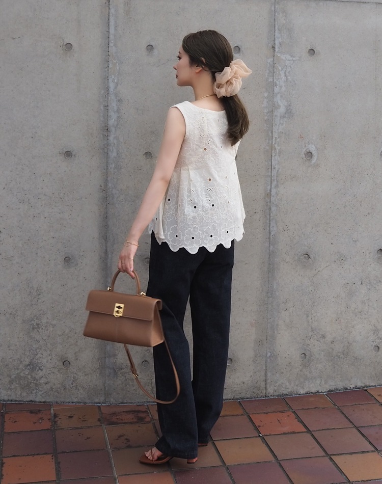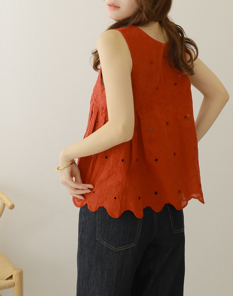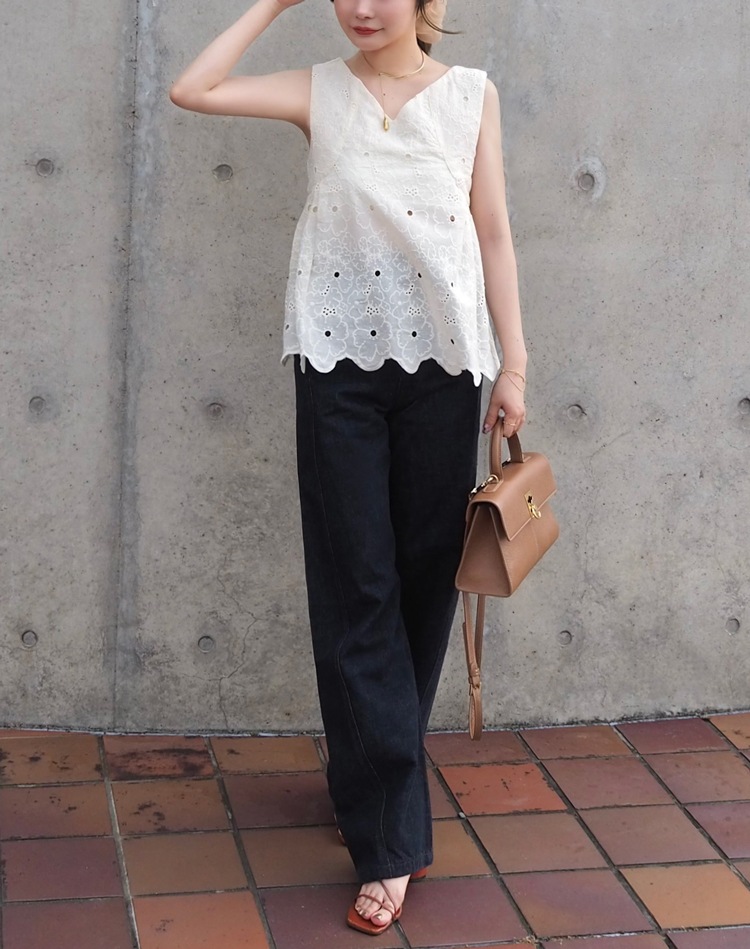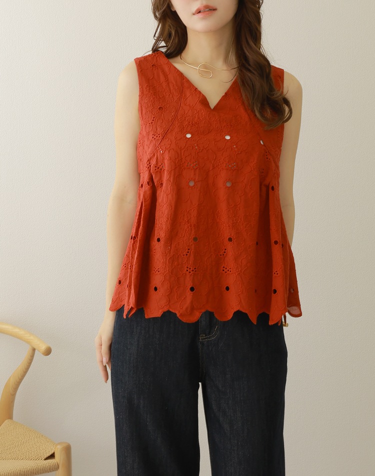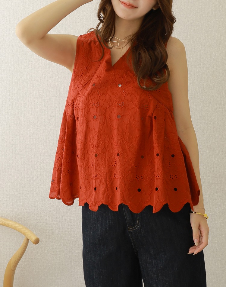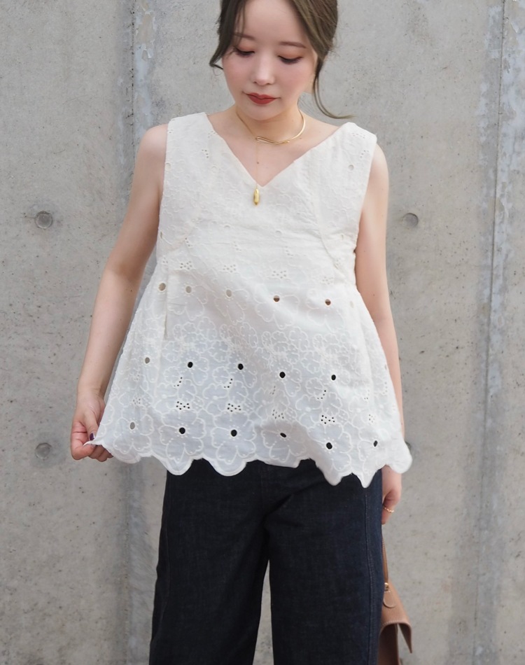 オープンカットを施したフラワー刺繍がレディなサマーブラウス。