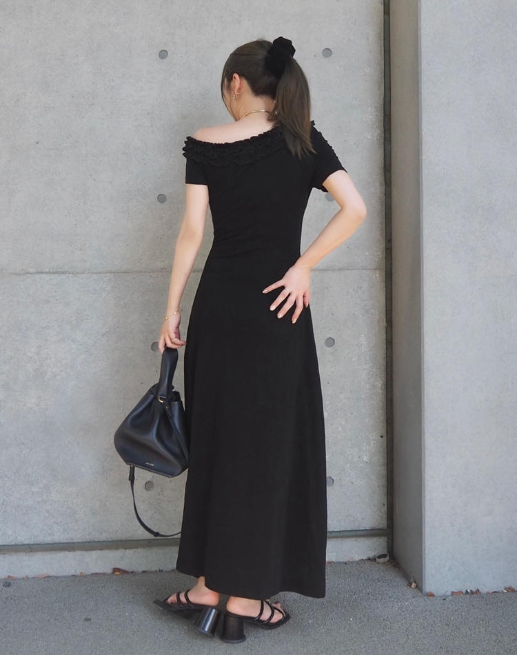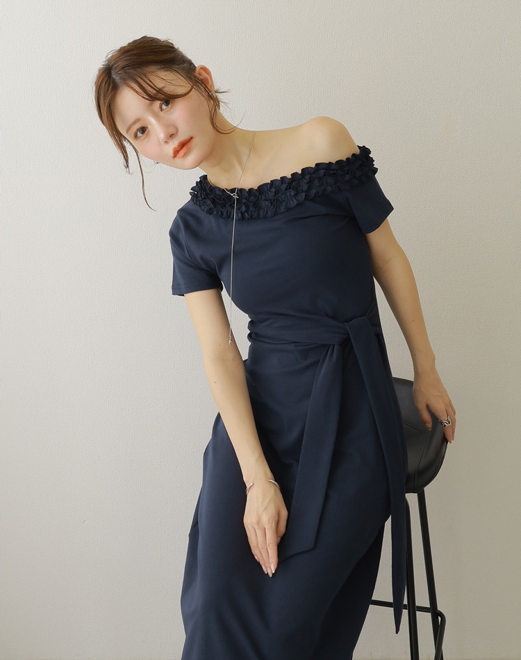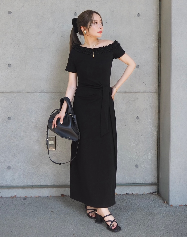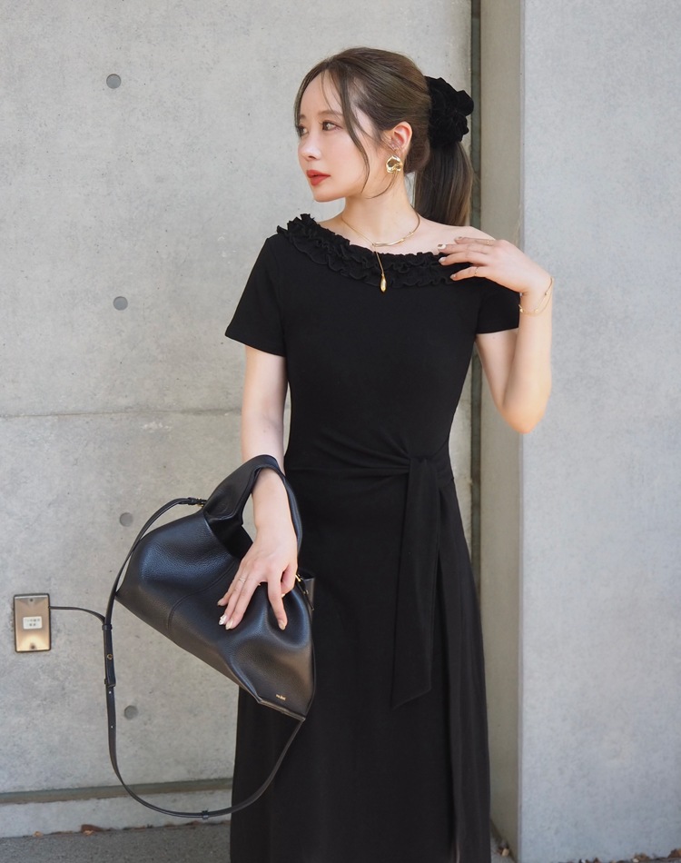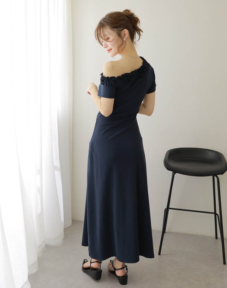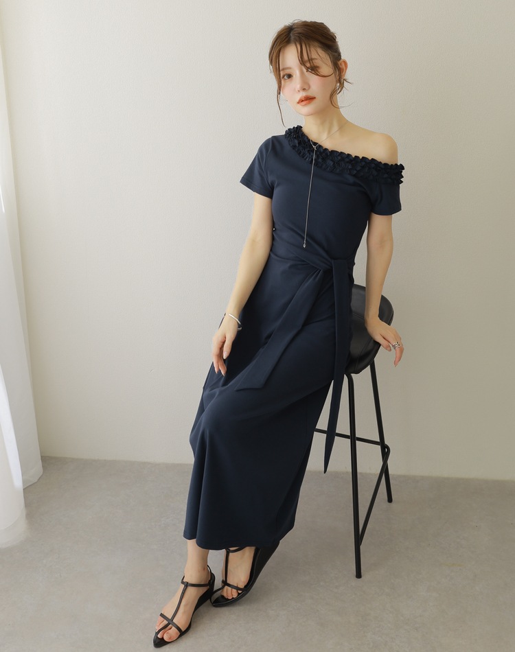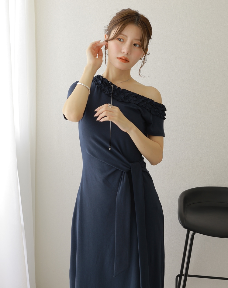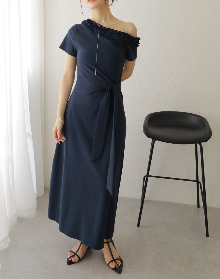 フリル使いのワンショルダーがおしゃれな肌見せを叶えるロングワンピース。