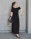 ツイストしたウエストリボンがメリハリをもたらし、縦のラインを強調するシルエットも相まってフェミニンな佇まいに。