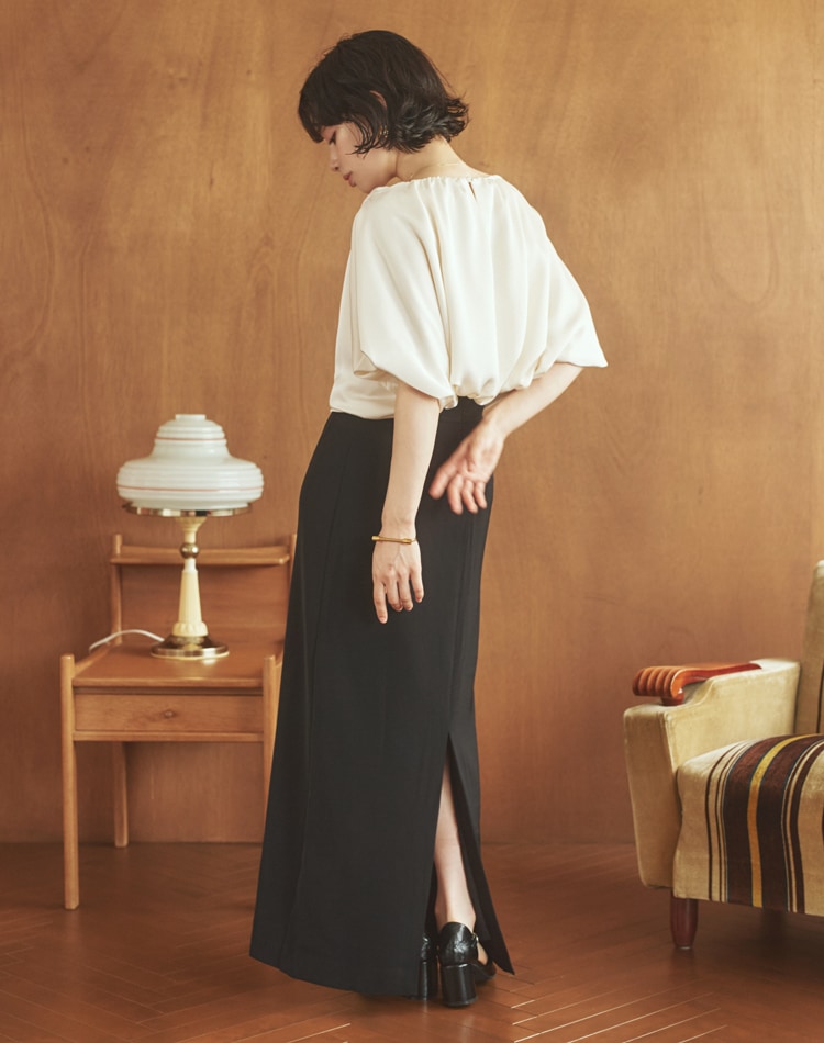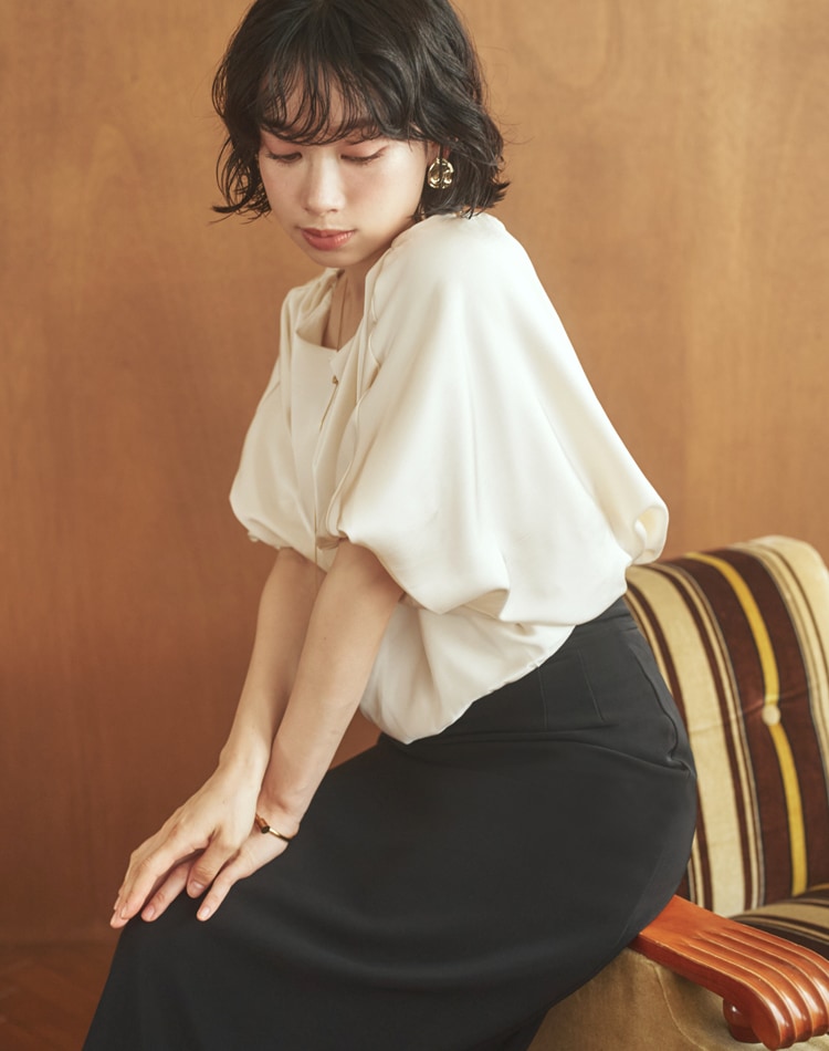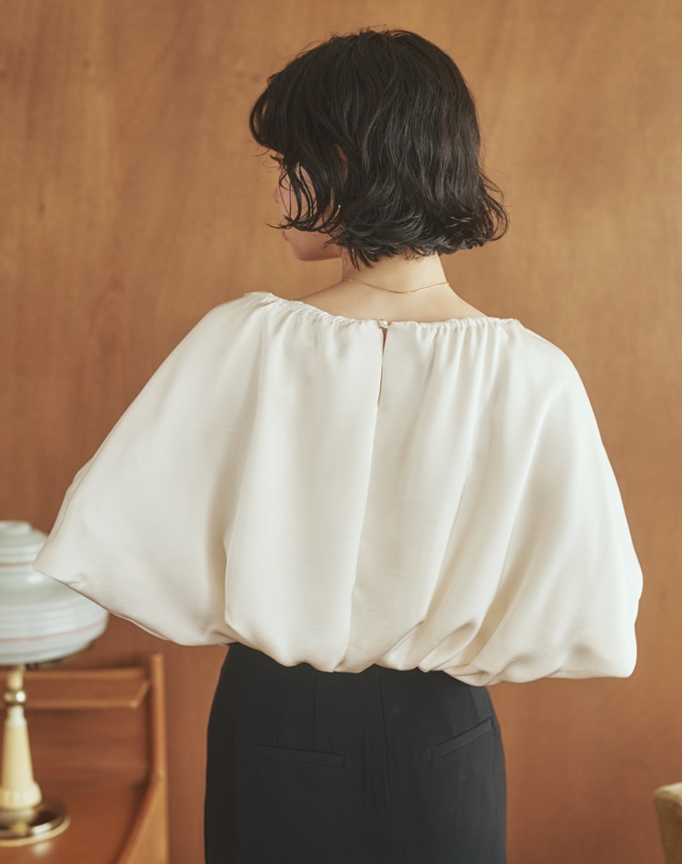 ふわりと優しげに膨らむバルーンスリーブは、二の腕をカバーしてくれる嬉しい効果も◎
