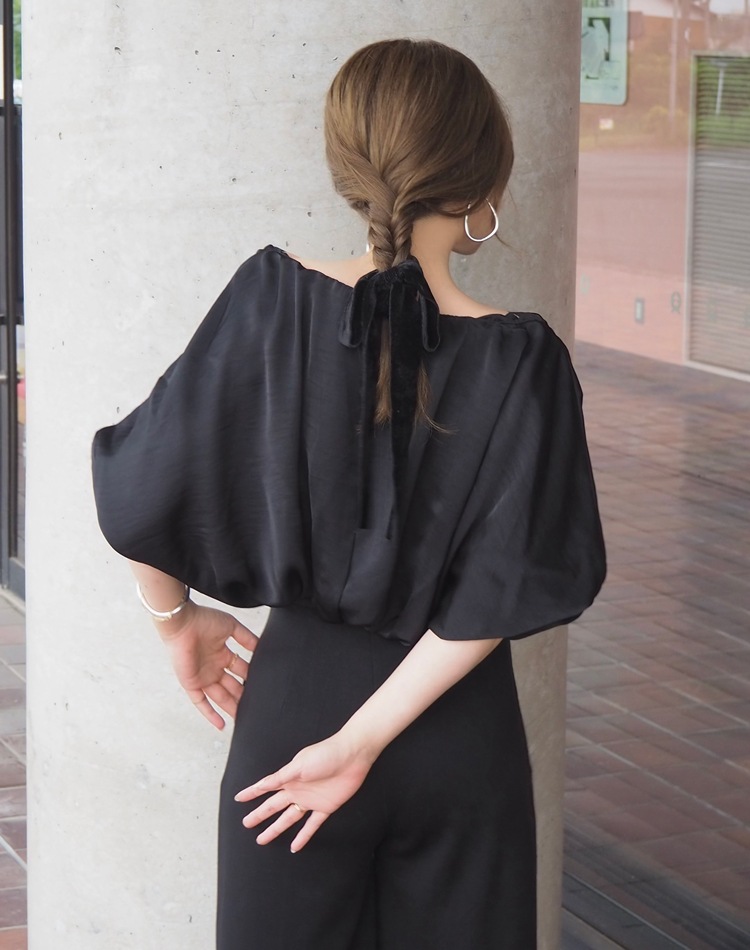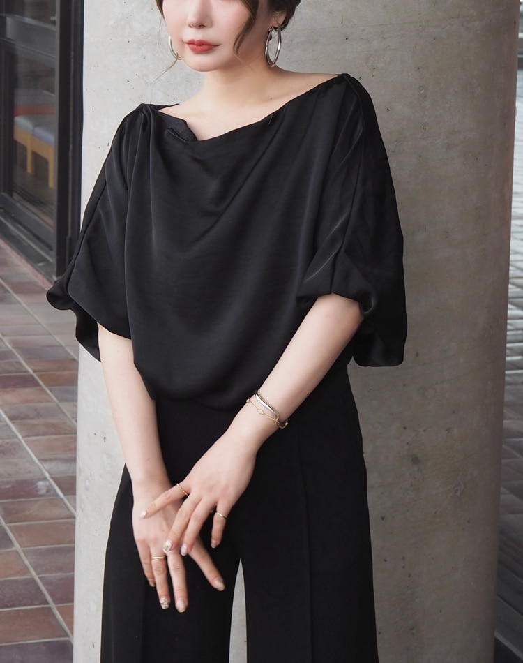 アシンメトリーなネックラインで魅せるサテンブラウス。