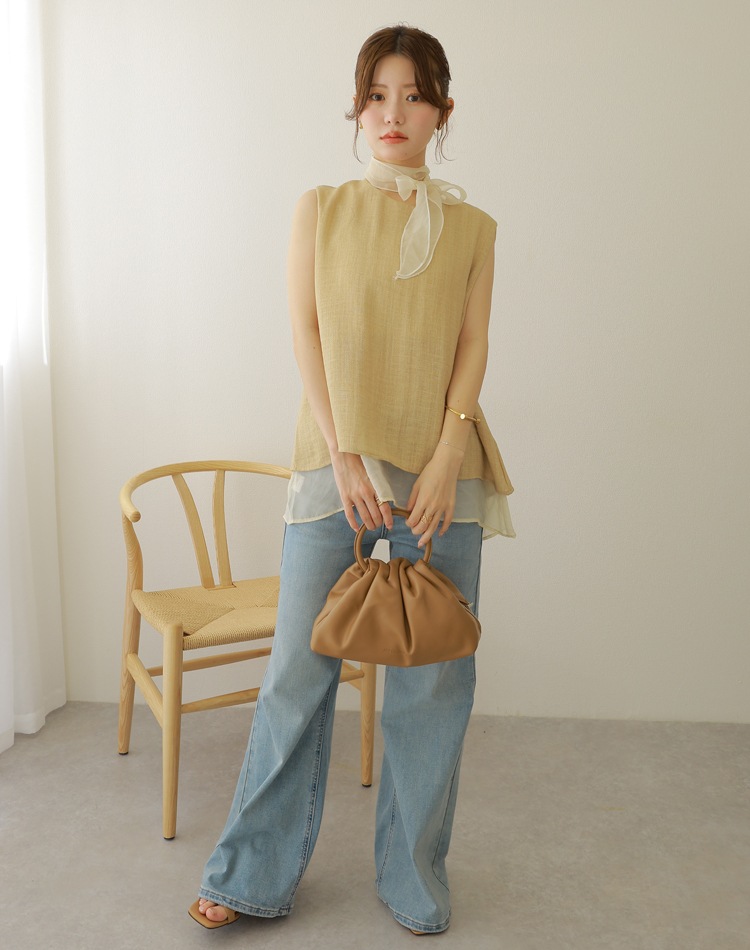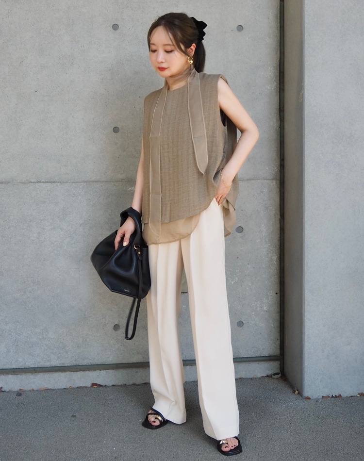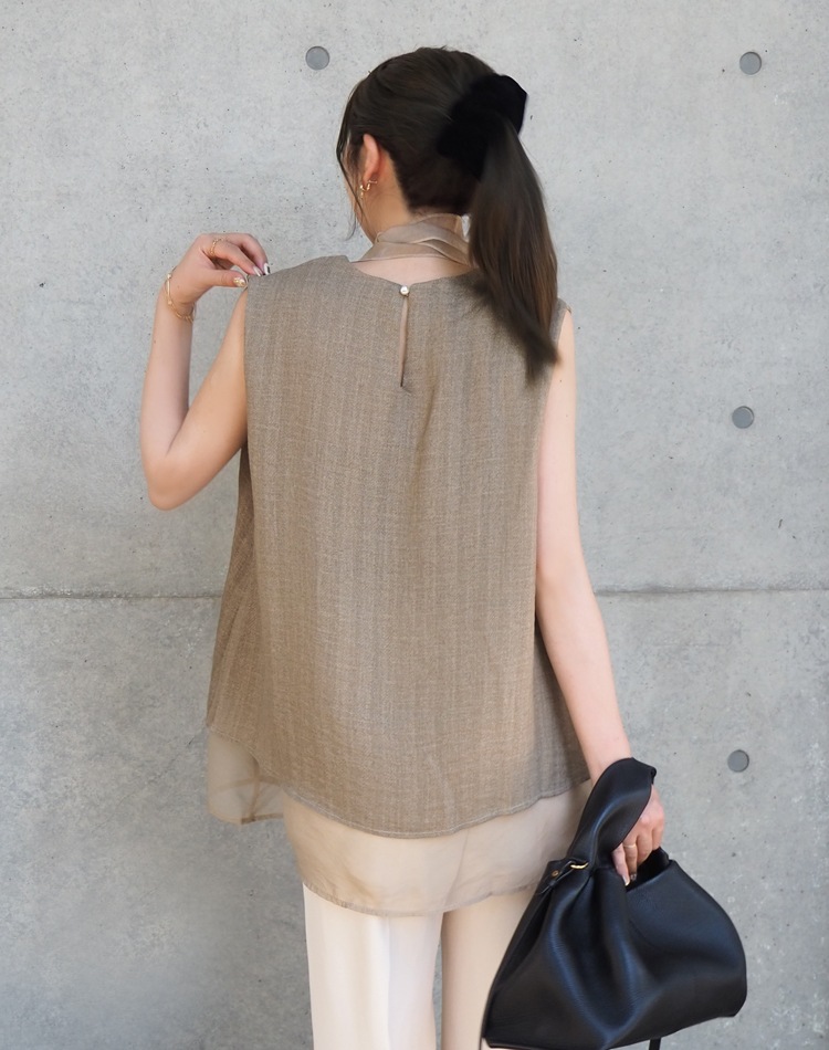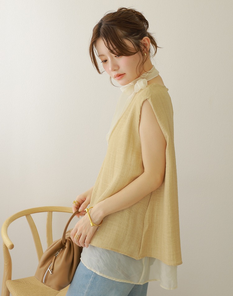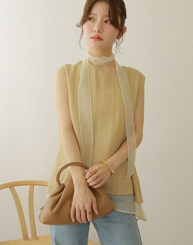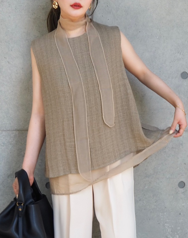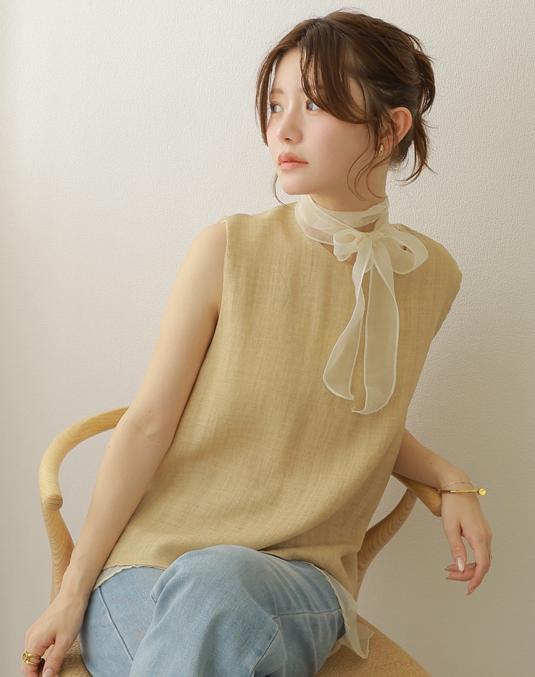 シアー素材とのコンビが涼やかさを演出するノースリトップス。