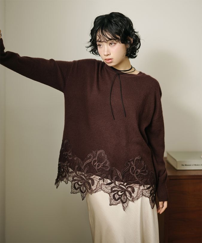 botanical embroidery lace knit pullover