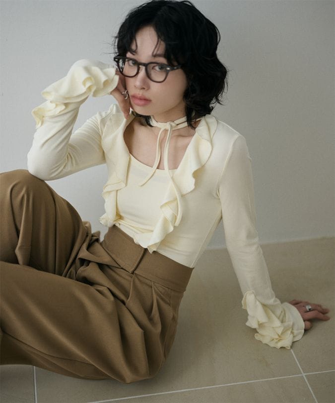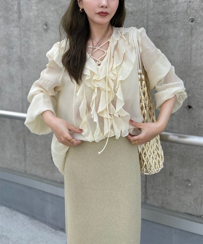 chiffon front frill lace up blouse